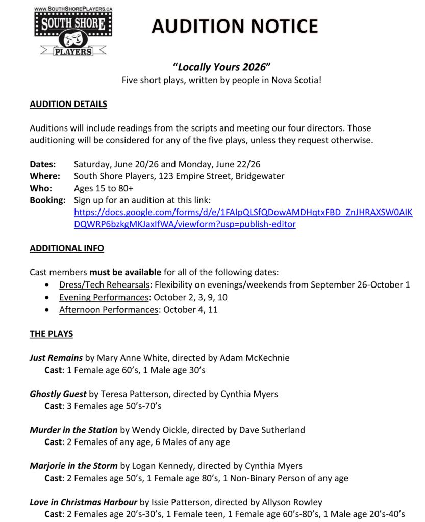 AUDITION NOTICE – Locally Yours 2026 Apr 17, 2026 | Audition Post, Homepage, Theatre News Click here to book an audition time.